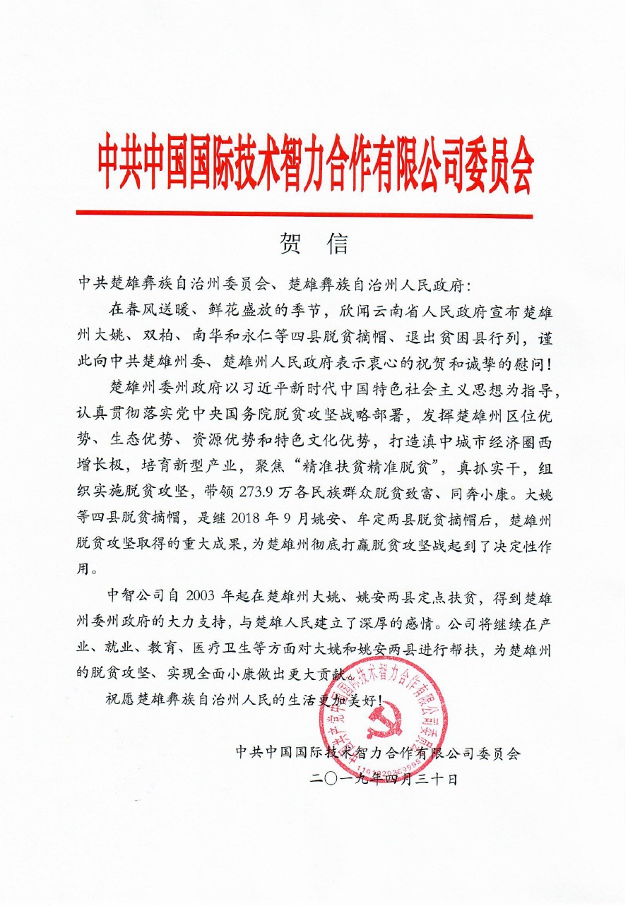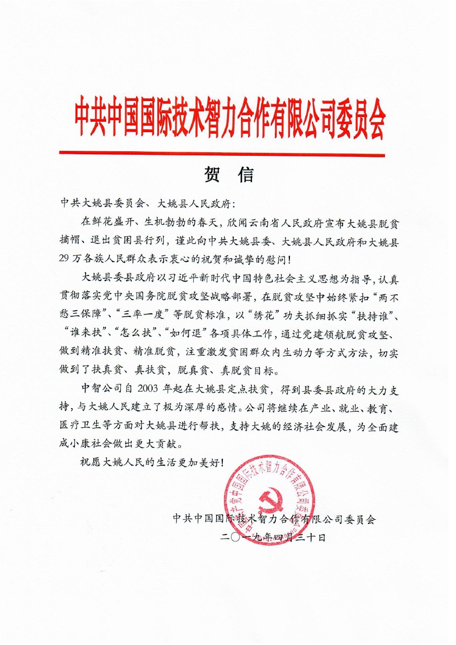 中智公司將認真貫徹落實黨中央國務院脫貧攻堅戰(zhàn)略部署,繼續(xù)幫扶大姚、姚安兩縣,鞏固脫貧成果,支持兩縣經(jīng)濟社會發(fā)展,為全面建成小康社會做出更大貢獻。
