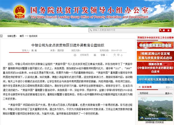 國務(wù)院扶貧開發(fā)領(lǐng)導(dǎo)小組辦公室網(wǎng)站刊登中智公司扶貧新聞